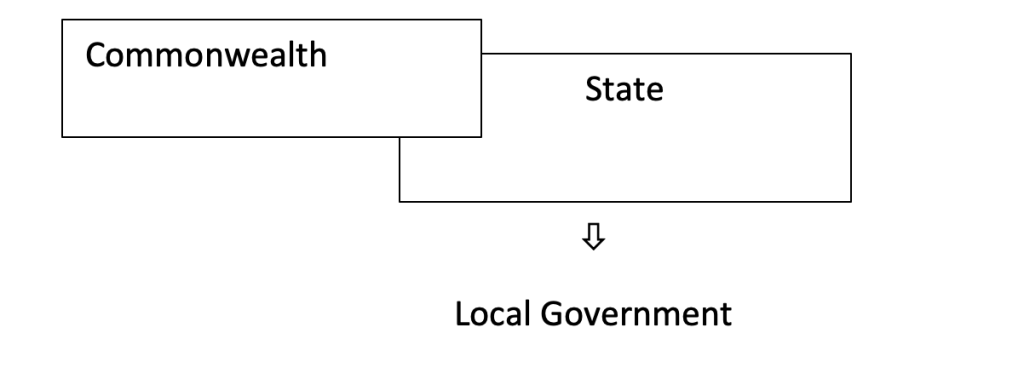 Local Government is a creature of state legislature so it sits squarely under the states subject to the direction and control of the state government. The states however pre-existed (as colonies) the Commonwealth and exist independently of the Commonwealth. Remove the Australian Constitution and the states are still there (Australian Constitution s 107). But in my diagram the states sit slightly behind and below the Commonwealth.