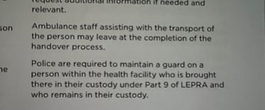 Police are required to maintain a guard on a person within a health facility who is brought there in their custody under Part 9 of LEPRA and who remains in their custody.