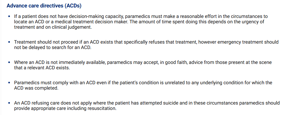 That section give immunity from criminal law ie it is not an assault (Stuart v Kirkland-Veenstra [2009] HCA 15, [43] (French CJ) to try and stop someone jumping in front of a train.  But, said French CJ, ‘It was not suggested that it had any part to play in determining whether officers Stuart and Woolcock owed a legal duty of care to the deceased and his wife’.  Just as the question of the police officer’s duty to Mr Veenstra who had been contemplating suicide was not determined by s 463B, so too a doctor’s or paramedic’s duty to their patient will not be determined or should not be determined by that section.  The health practitioner’s duty is to respect their patient’s autonomy and not to provide care that the person has expressly refused relying on a statute that has been put in place specifically to allow a person to give or refuse consent.