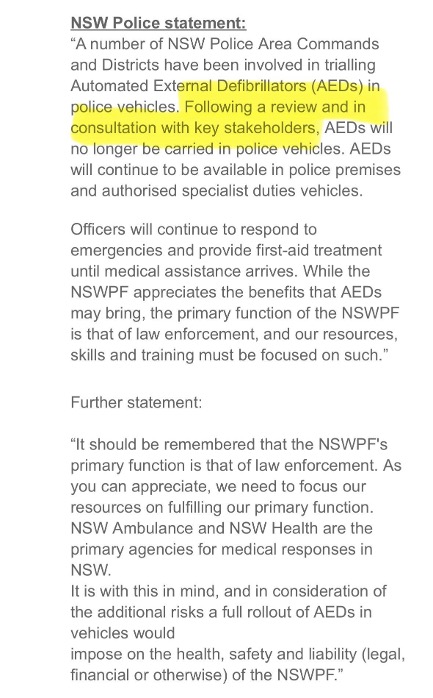 I have been told that NSW police have decided to remove Automated External Defibrillators from their cars. I have been given a copy of a page that looks like a press release but I can’t find the original source, but I’ll accept what it says is the official police view.