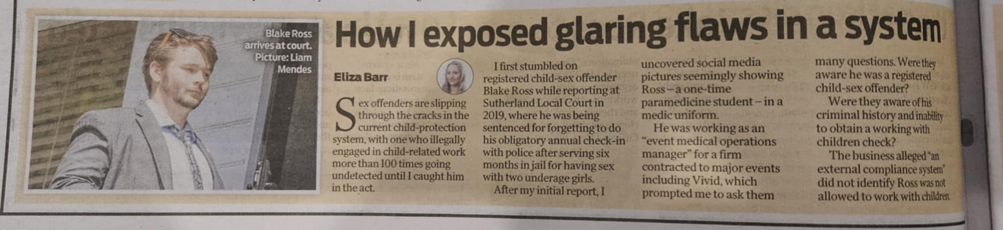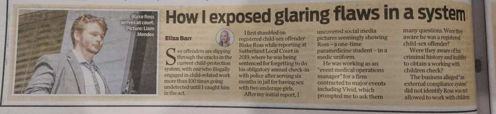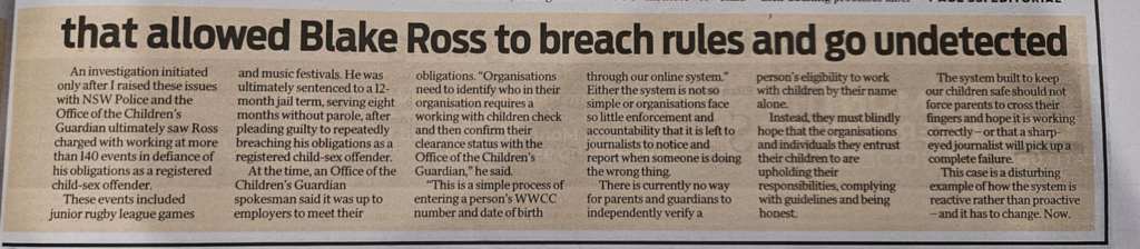 In this case Mr Ross was obligated not to undertake child related work. His failure to meet that obligation led to his imprisonment for 12 months. The journalist, Eliza Barr says ‘This case is a disturbing example of how the system is reactive rather than proactive…’