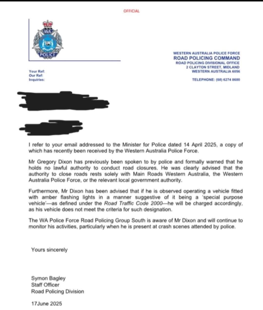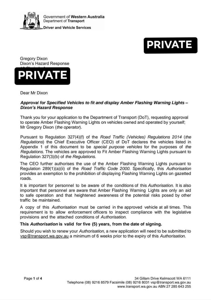 The letter from police says that Dixon’s vehicle, fitted with yellow flashing lights, does not meet the criteria of a ‘special purpose vehicle’. A special purpose vehicle is defined in the Road Traffic Code 2000(WA) as, amongst other things, ‘a vehicle duly authorised as a special purpose vehicle for the purposes of these regulations, by the CEO’.