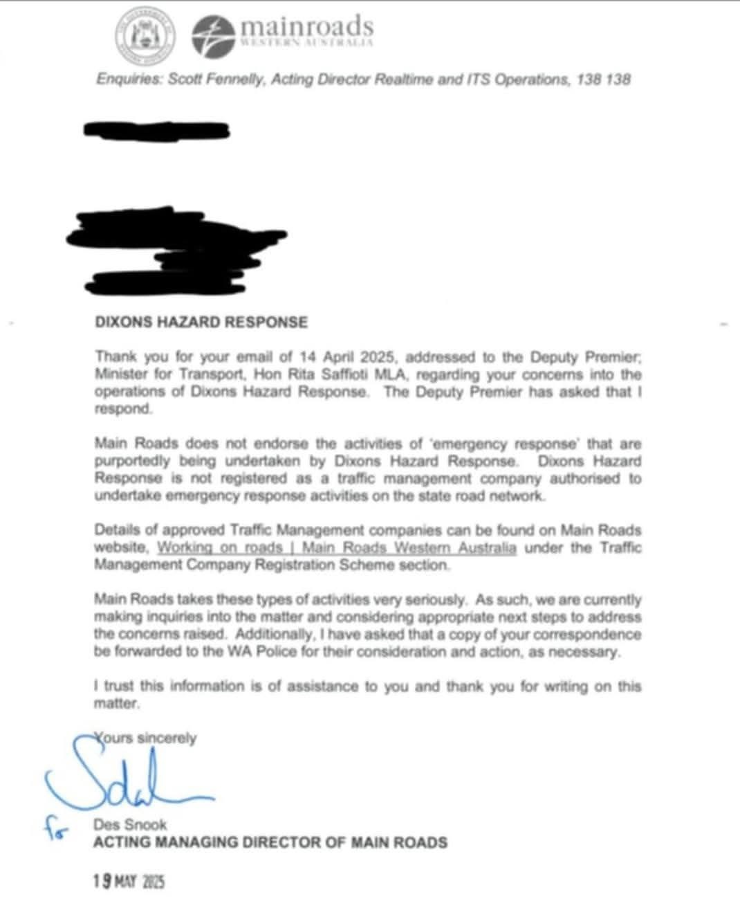 In addition to the referral please be advised that Main Roads recently issued a formal cease and Desist notice to Dixon’s Hazard Response, this correspondence reiterates that Main Roads does not authorise or endorse the emergency response activities being carried out by Dixon’s Hazard Response on highways or main roads under the commissioner’s care and control.